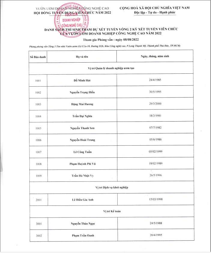 DANH SÁCH THÍ SINH THAM DỰ XÉT TUYỂN VÒNG 2 KỲ XÉT TUYỂN VIÊN CHỨC CỦA VƯỜN ƯƠM DOANH NGHIỆP CÔNG NGHỆ CAO NĂM 2022