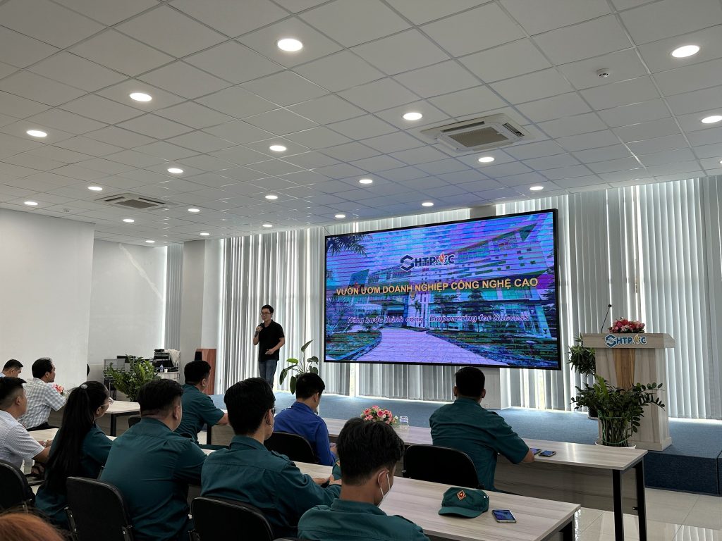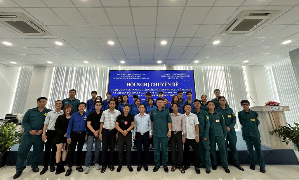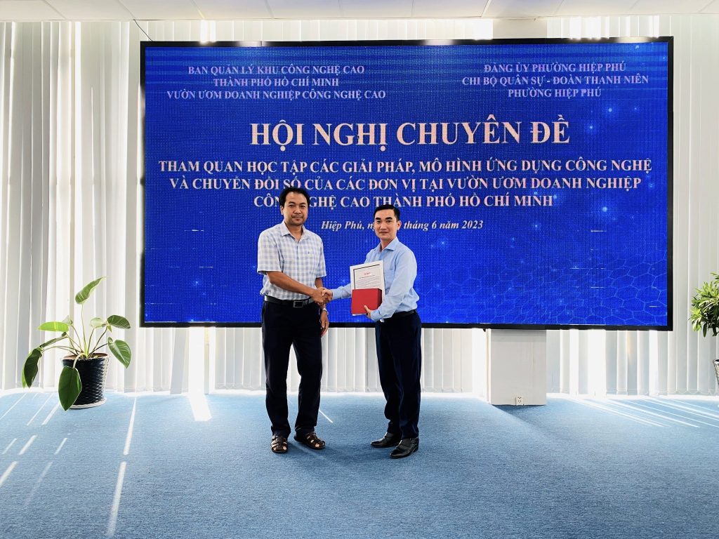 Chi bộ Quân sự và Đoàn thanh niên phường Hiệp Phú đã có buổi tham quan và học tập tại Vườn ươm Doanh nghiệp Công nghệ cao, tìm hiểu về các mô hình giải pháp ứng dụng chuyển đổi số đến từ các startup công nghệ ươm tạo tại Vườn ươm. Bên cạnh đó, các anh chị cũng được nghe giới thiệu về gannha.com và Gremsy, tham quan không gian làm việc và các hoạt động thử nghiệm, điều khiển sản phẩm ngay tại khuôn viên Vườn ươm; học hỏi thêm về các dự án công nghệ đang được ươm tạo tại showroom của Vườn ươm.