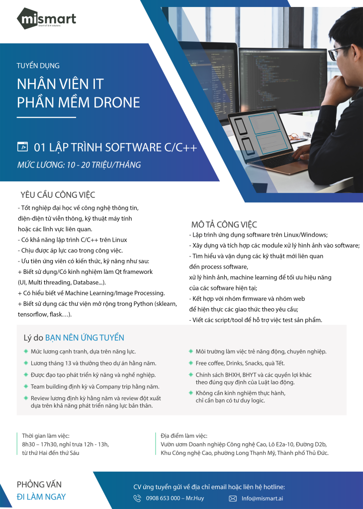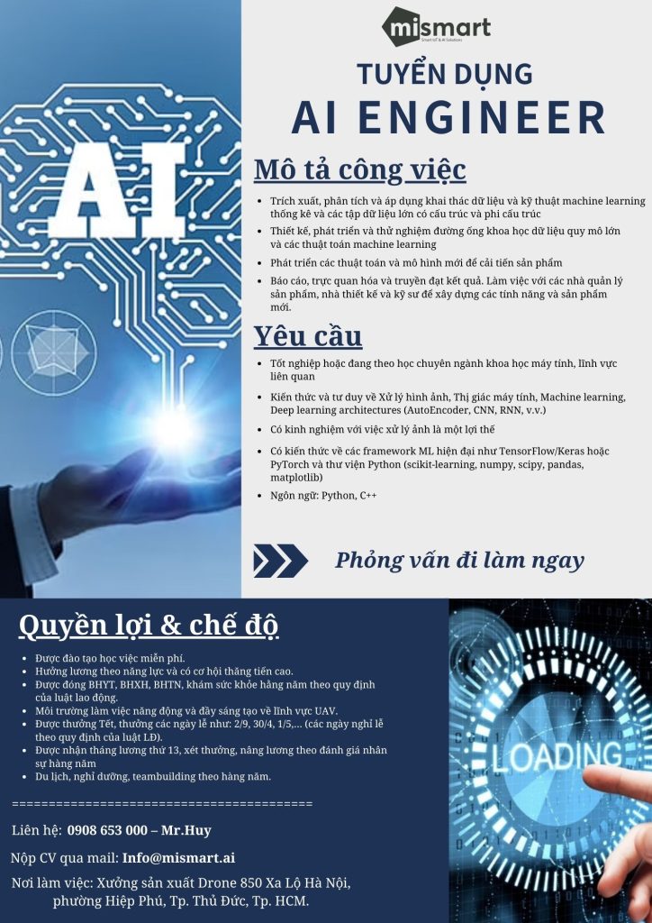 CV ứng tuyển gửi về địa chỉ email: Info@mismart.ai hoặc liên hệ số điện thoại/Zalo: 0908 653 000 – Mr.Huy