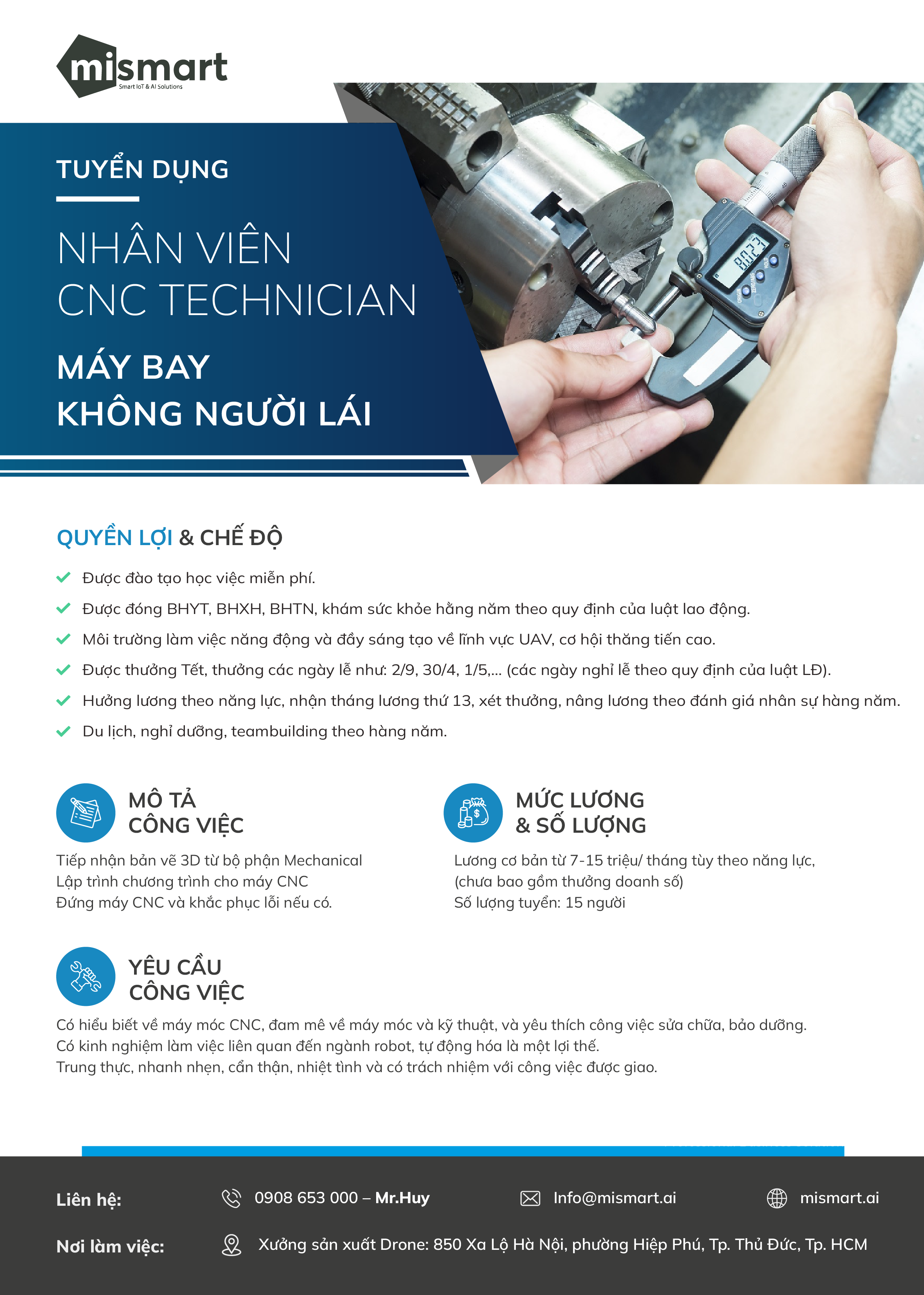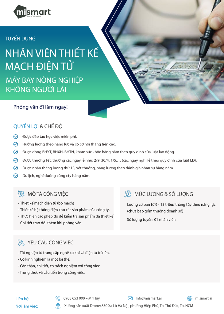 Địa điểm làm việc: Xưởng sản xuất Drone 850 Xa Lộ Hà Nội, phường Hiệp Phú, Tp. Thủ Đức, Tp. HCM