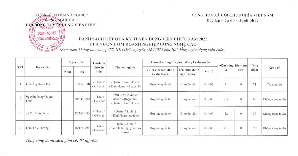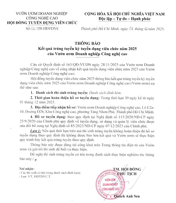 THÔNG BÁO: KẾT QUẢ TRÚNG TUYỂN KỲ TUYỂN DỤNG VIÊN CHỨC NĂM 2025 CỦA VƯỜN ƯƠM DOANH NGHIỆP CÔNG NGHỆ CAO